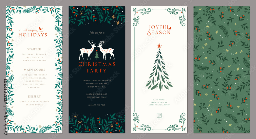 >Obrazy na płótnie Canvas>Wybrane motywy - zobacz więcej !>Liście>Winter Holiday cards. Universal Abstract Christmas tall templates 4x9 with decorative Christmas Tree, reindeers, ornate floral background and frame with copy space, bird and greetings.