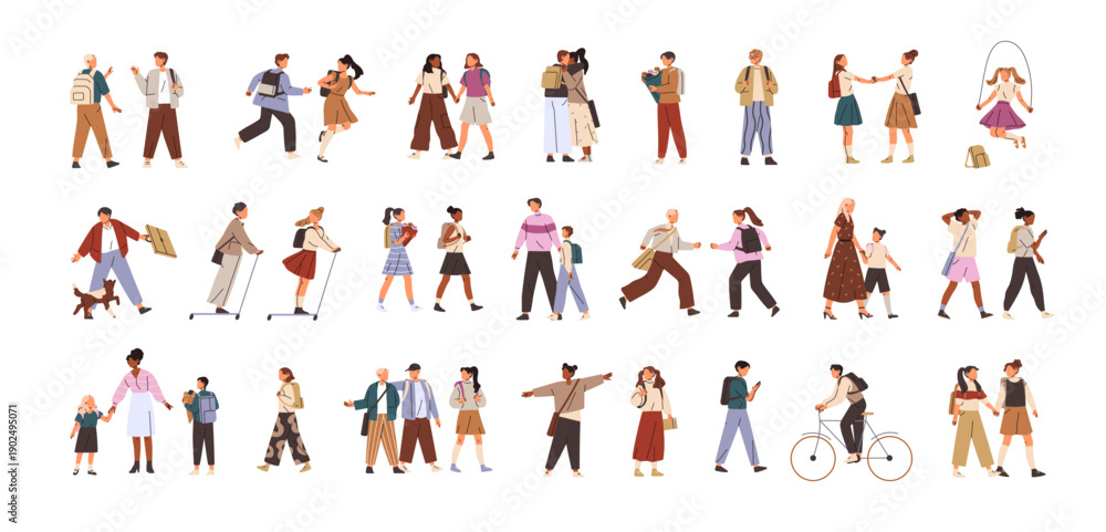 >Obrazy na płótnie Canvas>Wybrane motywy - zobacz więcej !>Liście>Set of happy school kids. Tiny people with backpacks are cycling, running, having fun. Children in uniform walk. Diverse students ride, go, hug. Flat isolated vector illustrations on white background.