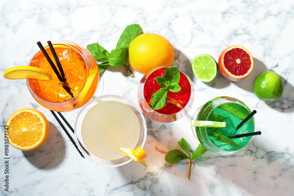 Obraz na płótnie Canvas - Different tasty refreshing cocktails in glasses, fresh citrus fruits and mint on light marble table, flat lay.
