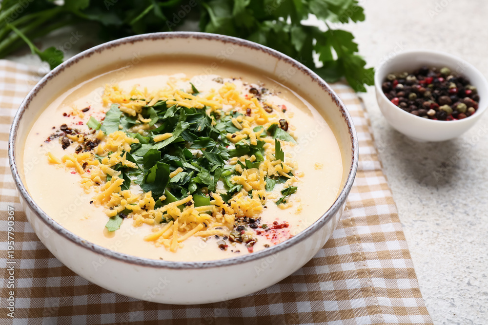 Obraz na płótnie Canvas - Bowl of tasty cheese soup with parsley and peppercorns on white background, closeup.