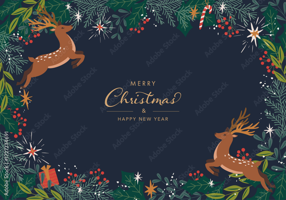 Obraz na płótnie Canvas - ヒイラギやトナカイで装飾したクリスマスカード。フラットなデザイン。ベクター背景。.