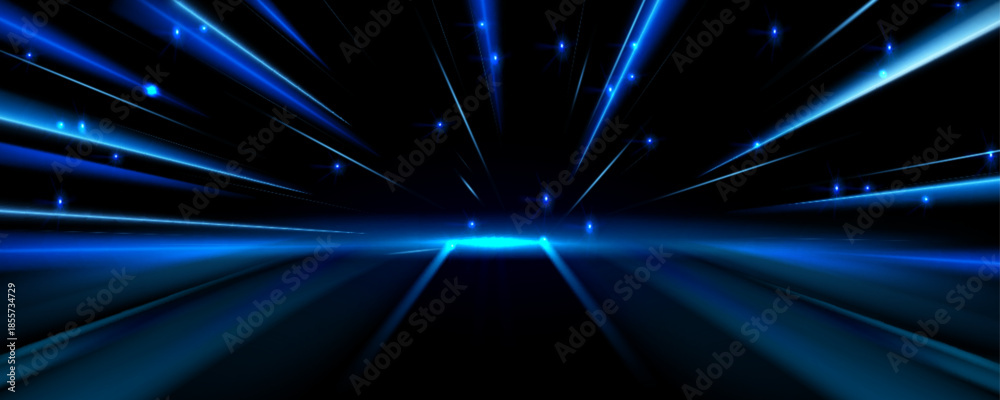 Obraz na płótnie Canvas - Speed light trails with neon blue lines radiating across dark background. Futuristic tech motion effect with luminous beams and glowing particles - dynamic energy burst on fast digital velocity scene..