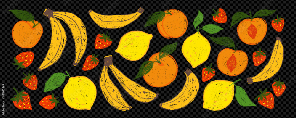 Obraz na płótnie Canvas - Funky crayon fruit stickers with chalk texture on black transparent background. Hand drawn playful colorful fruit clipart. Cute banana, strawberry, peach and lemon stickers. Childish naive style..