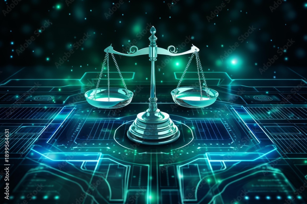 Obraz na płótnie Canvas - Scales of justice representing legal balance in a futuristic digital environment.