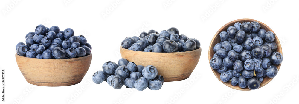Obraz na płótnie Canvas - Blueberries in wooden bowls, highlighting shapes, PNG.