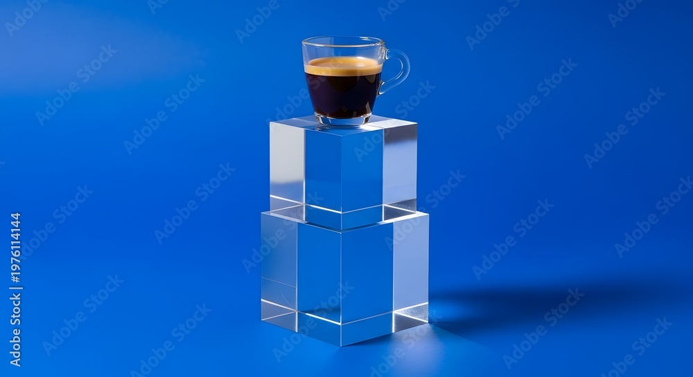 Obraz na płótnie Canvas - Secangkir kopi espresso hangat disajikan di atas tumpukan kubus kaca bening dengan latar belakang biru.