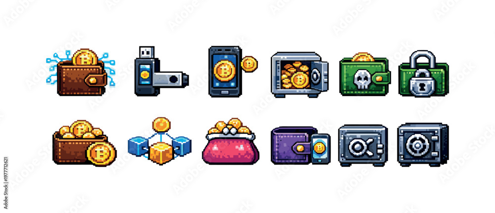 Obraz na płótnie Canvas - Pixel art icons representing cryptocurrency wallets, safes, and digital assets.