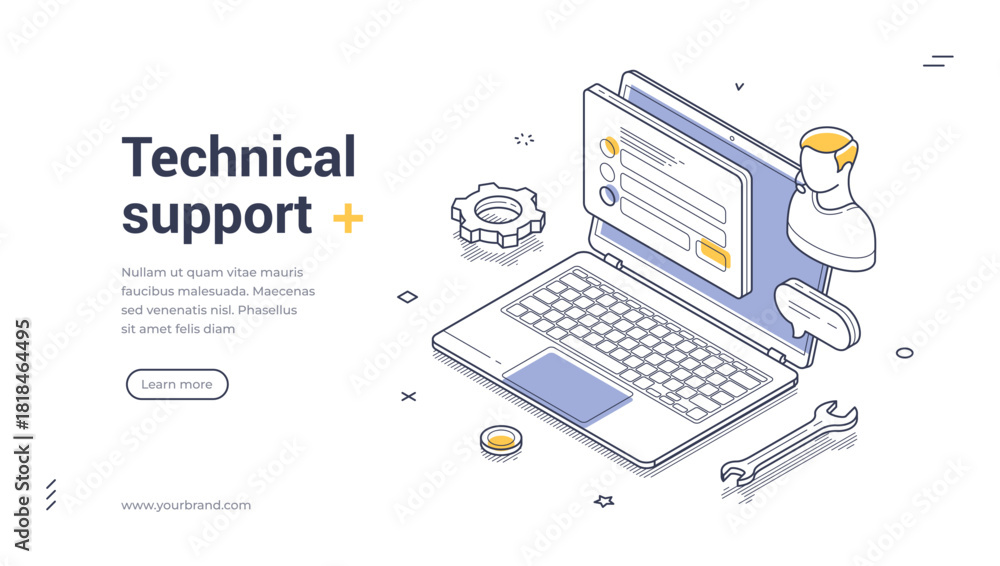 Obraz na płótnie Canvas - Technical support web banner with IT specialist, laptop, and tools for customer service, help desk, and troubleshooting. Modern isometric illustration for website and application.