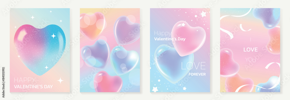 Obraz na płótnie Canvas - Happy Valentine’s Day background vector set. Pink and blue gradient heart illustration with glowing sparkles and ribbon elements. Romantic dreamy design for greeting cards, posters, invitations and lo.