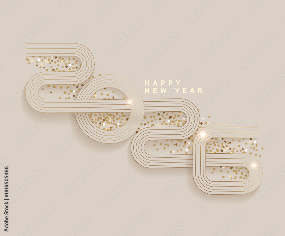 Obraz na płótnie Canvas - Elegant golden greeting card for 2026 New Year. Numbers from golden lines, confetti and shimmer. Luxury template for invitations, posters, flyers, banners, web. Premium vector design for New Year..