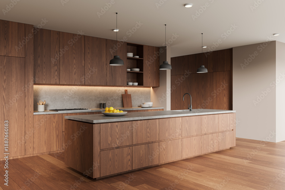 Obraz na płótnie Canvas - Modern interior kitchen with wooden cabinetry, island countertop, minimalist lighting, and natural tones in a stylish architectural design. 3D Rendering.