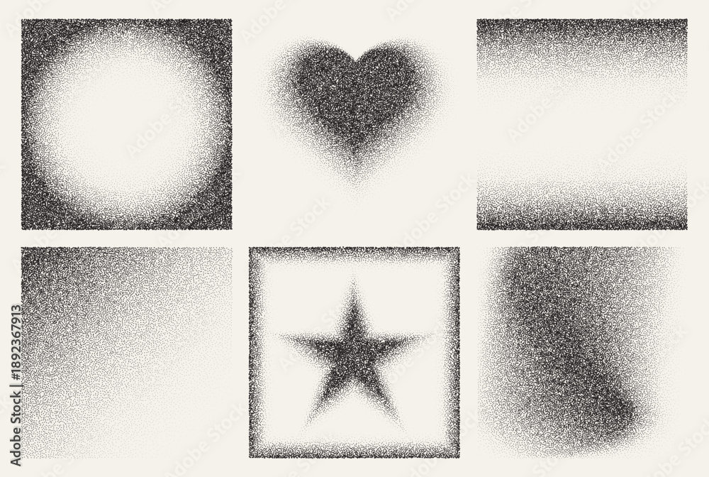 Obraz na płótnie Canvas - Grainy gradient texture square frames with vintage noise or spray effect and abstract dust patterns on white background. Vector illustration, grunge borders, star and heart for retro design.