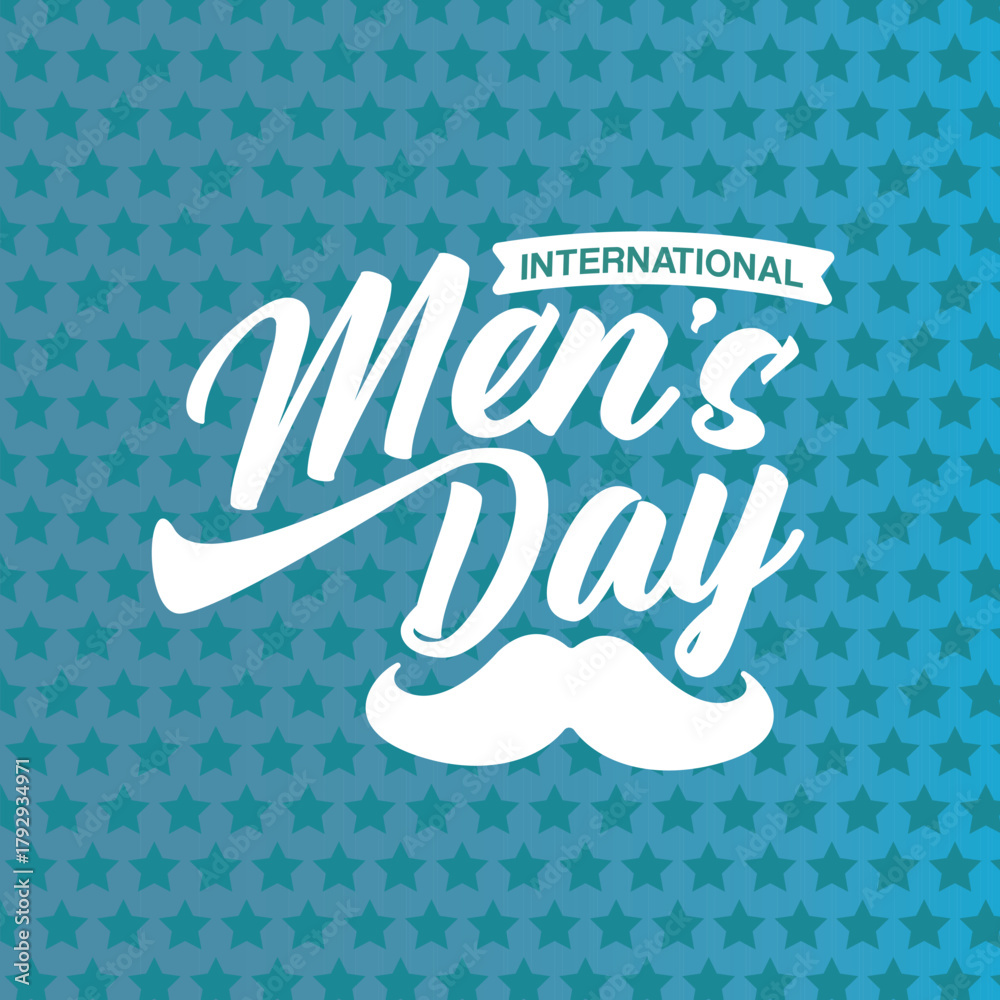 Obraz na płótnie Canvas - International Men's Day blue squre banner with lettering, mustache and on blue abstract background. Happy mens day poster with face, banner and sticker. WORLD MALE DAY.
