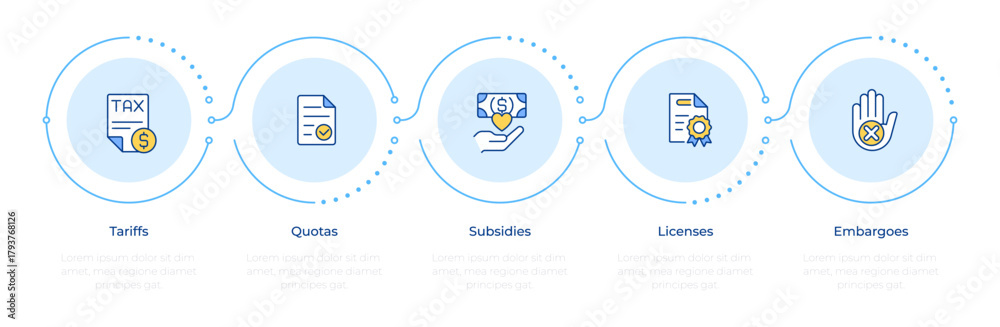 Obraz na płótnie Canvas - Trade policy instruments infographic 5 steps. Financial subsidies, regulatory licenses. Flow chart infochart. Editable vector info graphics icons. Montserrat-SemiBold, Regular fonts used.
