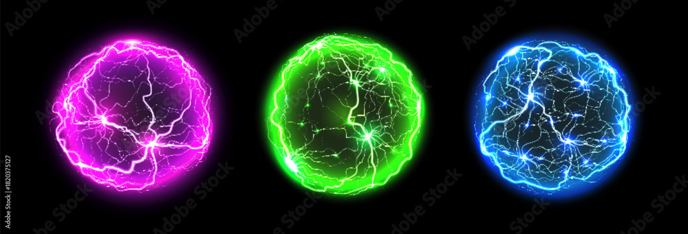 Obraz na płótnie Canvas - 3d magic ball plasma spheres with pink, green and blue neon glow and with electric lightning waves inside. Vector orbs feature neon light bursts and sparkling energy discharges for fantasy game.