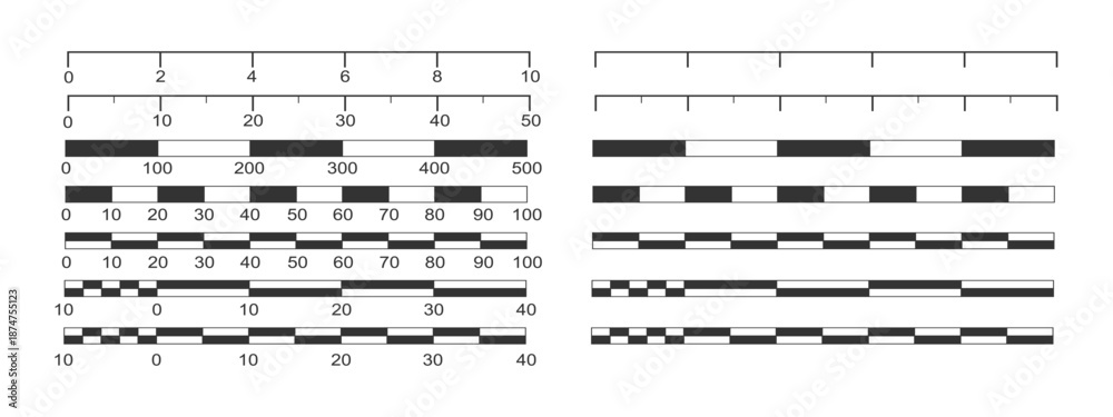 Obraz na płótnie Canvas - Set of line and bar map scales blank and with numbers. Distance measurement chart templates. Simple cartography navigation elements isolated on white background. Vector graphic illustration.