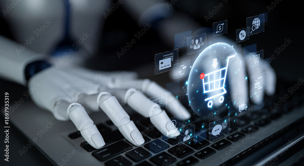 Obraz na płótnie Canvas - An AI assistant manages a global e-commerce marketplace, personalizing the online shopping experience. The system optimizes the customer journey from product search to final payment. Fermion.
