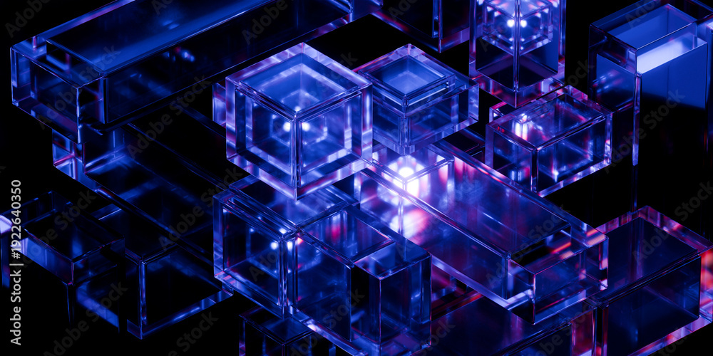 Obraz na płótnie Canvas - Cyber elements made of transparent glass and liquid acrylic purple blue glow on black backdrop cinematic tech background design cover art visuals 3d rendering.