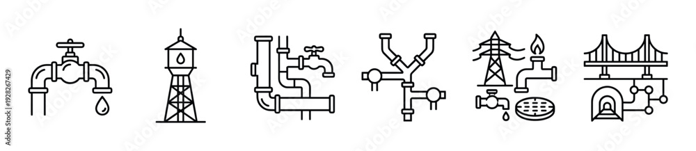 Obraz na płótnie Canvas - Collection of six minimalist line icons depicting municipal services and city infrastructure like plumbing, water towers, electricity, gas, and transportation.
