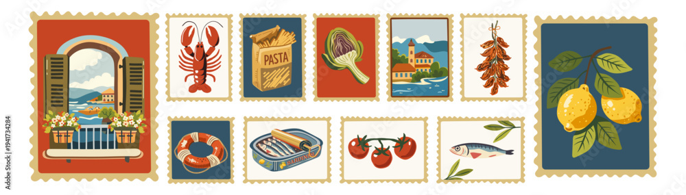 Obraz na płótnie Canvas - Vintage Italian postage stamp collection with Mediterranean food, lemons, sardines, coastal window, tomatoes and seafood illustrations. Retro travel themed vector set inspired Italian summer postcard.