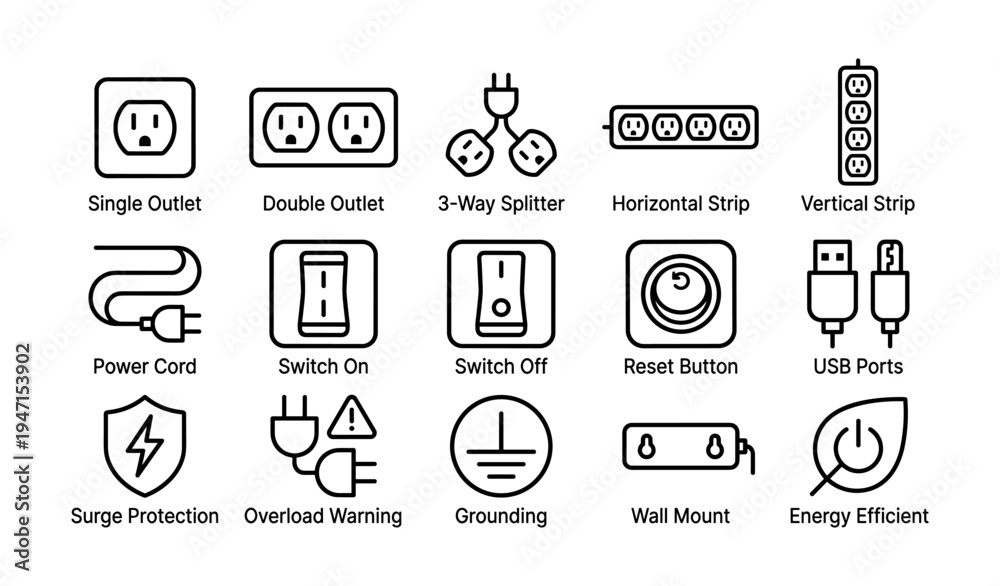 Obraz na płótnie Canvas - Various electrical outlets and switches icons with power and safety symbols.