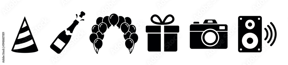 Obraz na płótnie Canvas - Collection of black silhouette party and celebration icons including a striped party hat, popping champagne bottle, balloon arch, wrapped gift box, camera, and speaker..