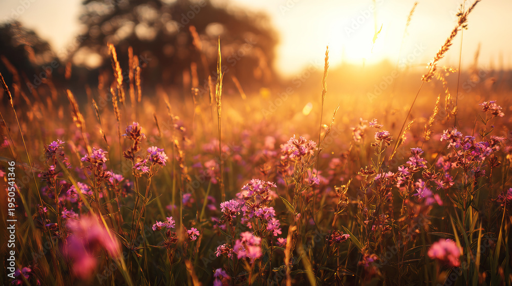 Obraz na płótnie Canvas - Wildflower meadow at golden hour, pink flowers blooming in warm sun rays, soft focus vibrant nature.