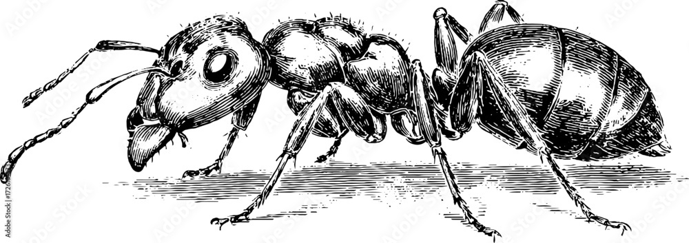 Obraz na płótnie Canvas - Engraving style illustration of worker ant in vintage silhouette for retro design.