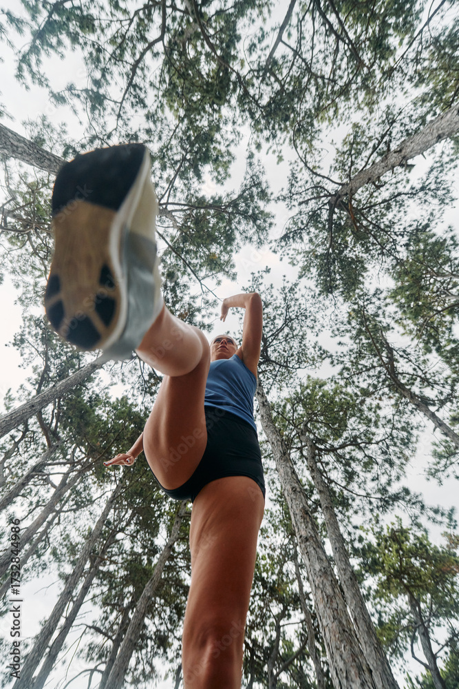 Obraz na płótnie Canvas - Adventurous Woman Overcoming Forest Obstacles with Determination and Agility..