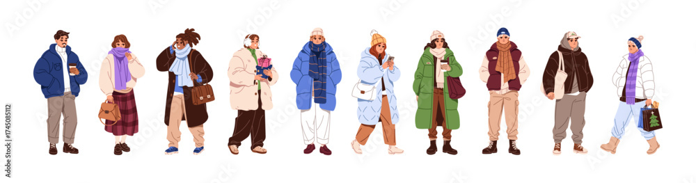Obraz na płótnie Canvas - Set of people in fashion winter clothes. Frozen men and women from cold weather are wearing outerwear- coat, jacket, scarf, hat and sweater. Flat isolated vector illustrations on white background.