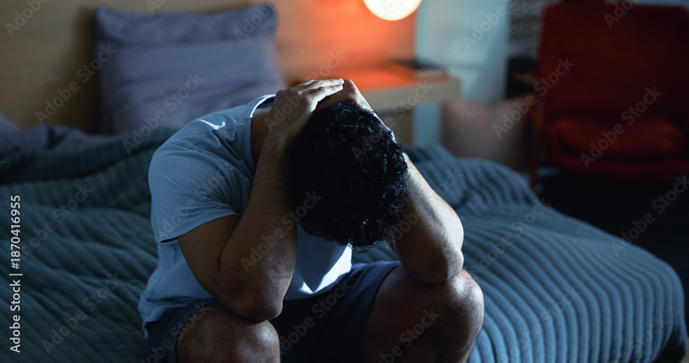 >Obrazy na płótnie Canvas>Wybrane motywy - zobacz więcej !>Muzyka>Insomnia, night and man in bedroom with stress for burnout, exhausted and fatigue for mental health. Tired, dark and person with upset, sad and anxiety for sleepless, bad dream and frustrated in home