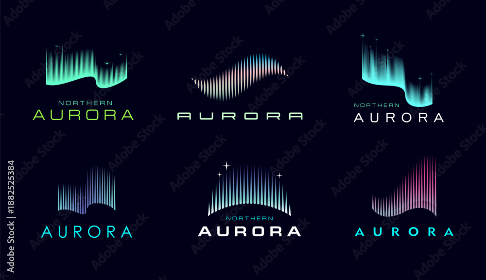 >Obrazy na płótnie Canvas>Wybrane motywy - zobacz więcej !>Muzyka>Northern aurora borealis sky wave light icons. Vector abstract northern light and aurora borealis isolated symbols set with gradient green purple line waves and glowing North Polar stars