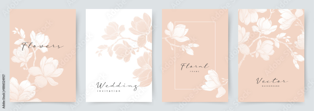 Obraz na płótnie Canvas - Elegant pink set of greeting cards with a magnolia blossom. Vector flower background for wedding invitation, card, social media, business card, flyer, banner, label.