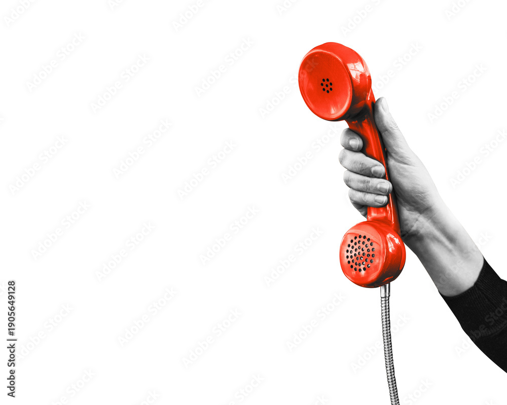 Obraz na płótnie Canvas - A woman's hand holds a red landline telephone, isolated on free png background..