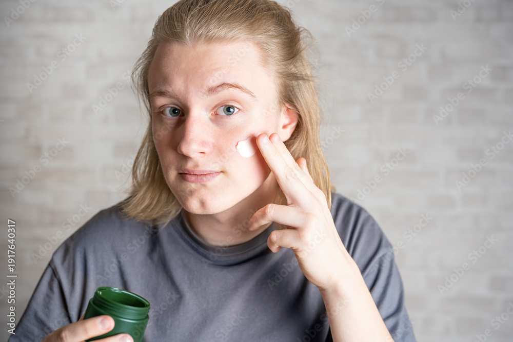 Obraz na płótnie Canvas - Young man (zoomer, teenager) applying moisturizer on his face.