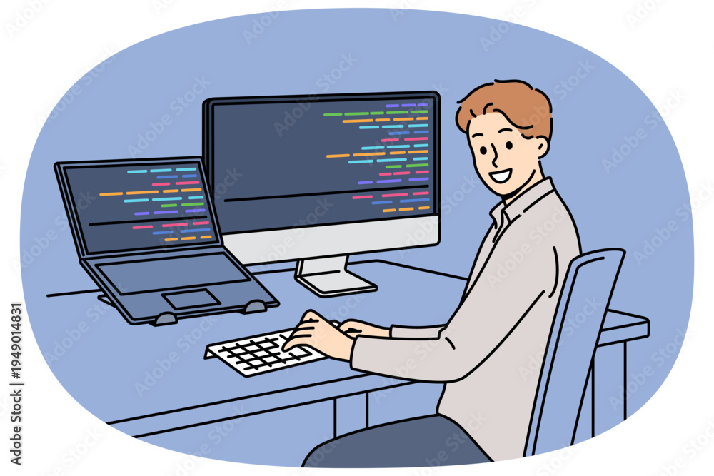 >Obrazy na płótnie Canvas>Wybrane motywy - zobacz więcej !>Muzyka>Man programmer types code and looks at camera, sitting at table with computer and laptop. Successful guy programmer develops software or application, working in team with UI or UX designers