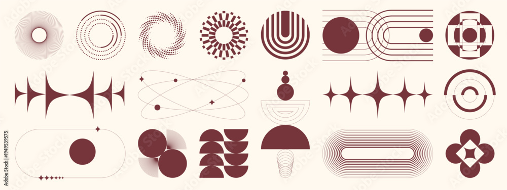 Obraz na płótnie Canvas - Luxury abstract line element set vector. Burgundy minimal geometric symbols, circles, waves, stars, and modern decorative shapes collection for branding, poster, and invitation design..