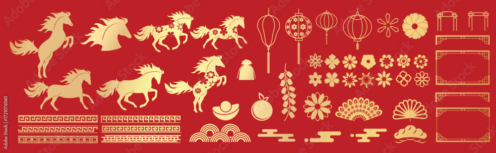 Obraz na płótnie Canvas - Chinese New Year 2026 element vector set. Year of the horse design. Lanterns, horse, firework, frame, pattern, cloud, coin, flower, pattern. Icons of Asian Lunar New Year holiday decoration. .