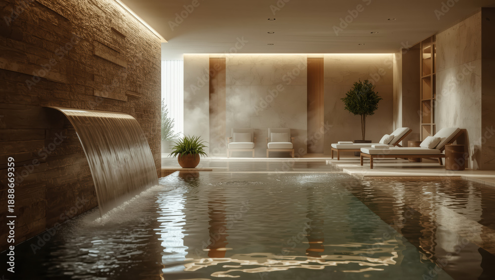 Obraz na płótnie Canvas - Serene hotel spa interior with indoor pool, waterfall feature, lounge chairs and ambient lighting.