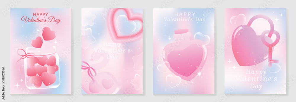 Obraz na płótnie Canvas - Happy Valentine's Day cute heart lock vector poster set with pastel pink and blue gradients, floating hearts and shimmer highlights. Lovely design for posters, cards, banners and social..