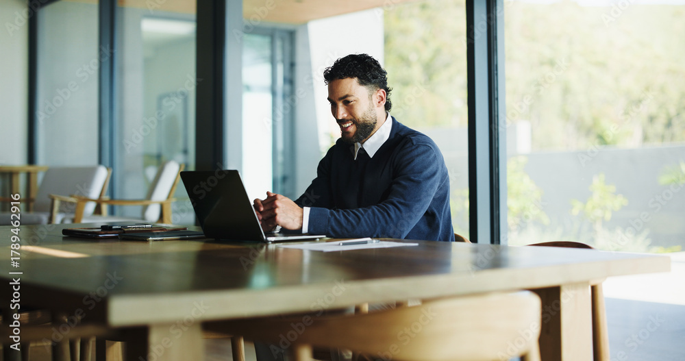 >Obrazy na płótnie Canvas>Wybrane motywy - zobacz więcej !>Niedźwiedź>Laptop, happy and research with business man in office for real estate broker, property listing and planning. Escrow account closer, realtor proposal and project with person in agency for report