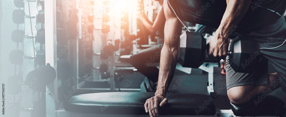 >Obrazy na płótnie Canvas>Wybrane motywy - zobacz więcej !>Niedźwiedź>Weights, arms and workout with man in gym for fitness equipment, dumbbell and health. Exercise and bodybuilder with person in center for weightlifting for muscle development and strength training