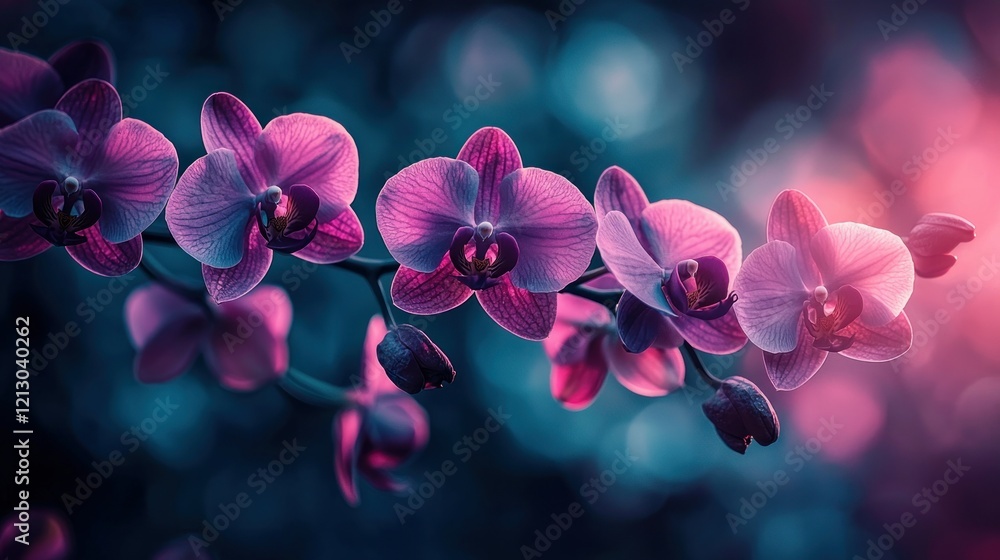 Obraz na płótnie Canvas - Pink orchids blooming on a stem, bokeh background, garden setting..