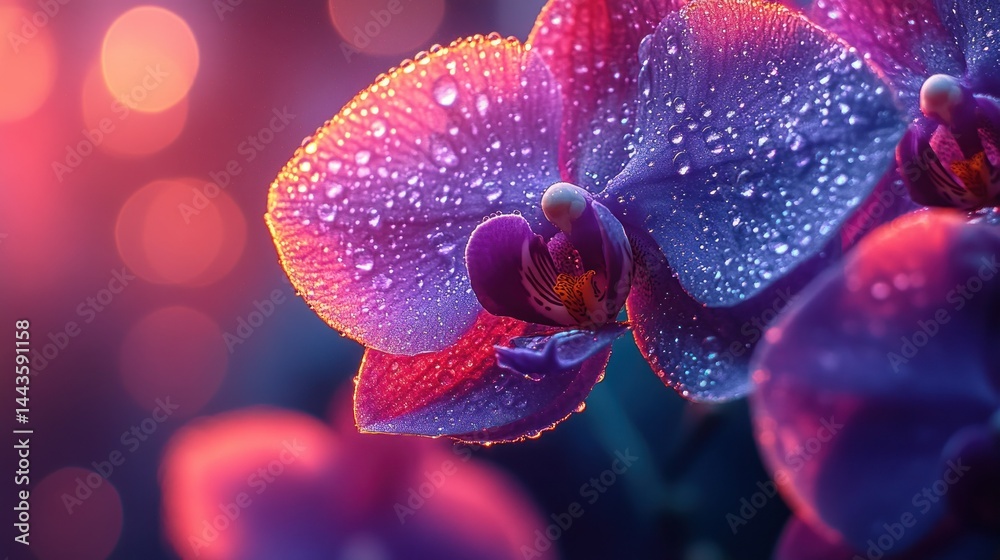 Obraz na płótnie Canvas - Vibrant orchid blossoms, dew drops, and soft lighting.