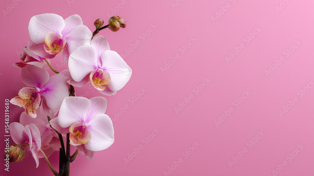 Obraz na płótnie Canvas - The top view of an orchid flower on a pink background offers a minimalist flat lay with text space..
