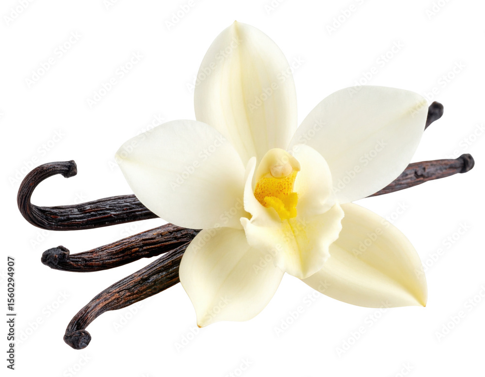 Obraz na płótnie Canvas - A creamy white vanilla orchid flower with smooth petals and a yellow center, accompanied by several dark brown dried vanilla pods..