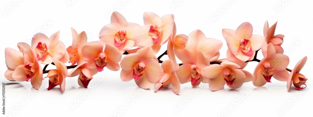 Obraz na płótnie Canvas - Beautiful brunch of orchid flowers banner panorama long - Peach fuzz orchids petals orchidaceae, isolated on white background..
