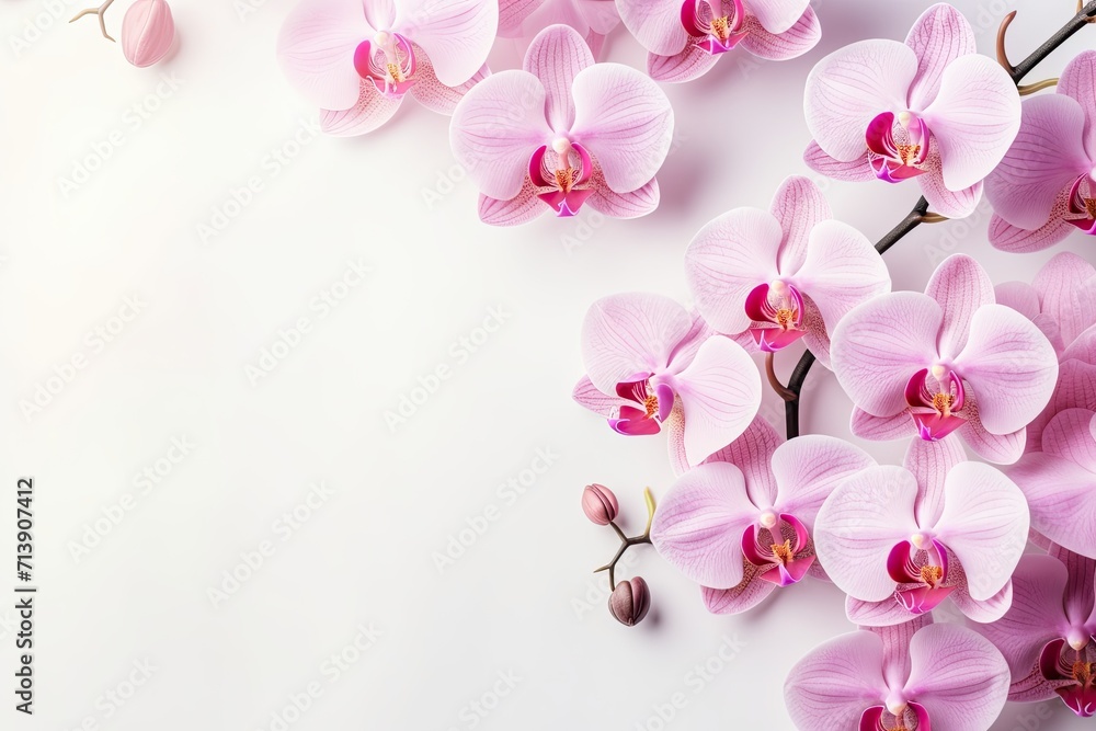 Obraz na płótnie Canvas - Close up of pink phalaenopsis orchids on a pastel background, with selective focus, creating a beautiful floral scene..