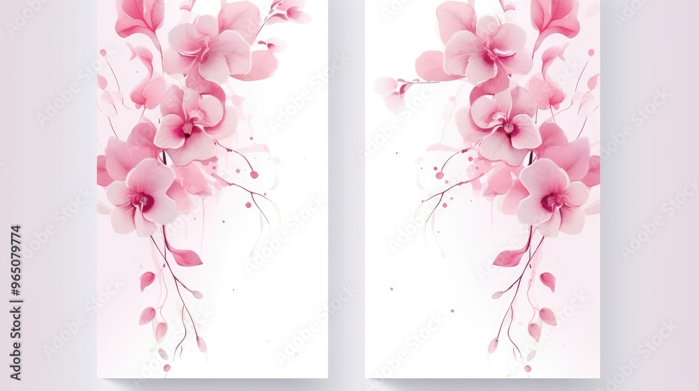 Obraz na płótnie Canvas - A delicate floral design with pink orchid flowers and leaves on a white background..