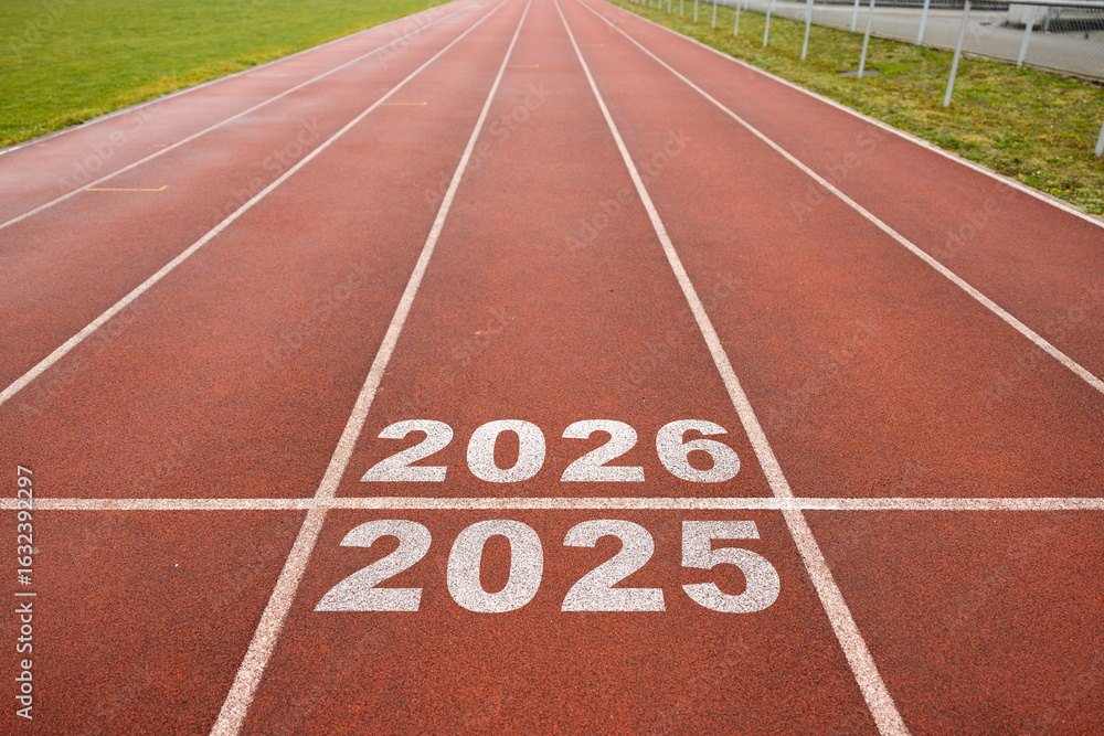 >Obrazy na płótnie Canvas>Wybrane motywy - zobacz więcej !>Owoce>Start of new year. Changes of year 2025, 2026, 2027 on Running track. Concept of new ideas starting in new year, planning along with setting objectives to set KPI goals for success in life.